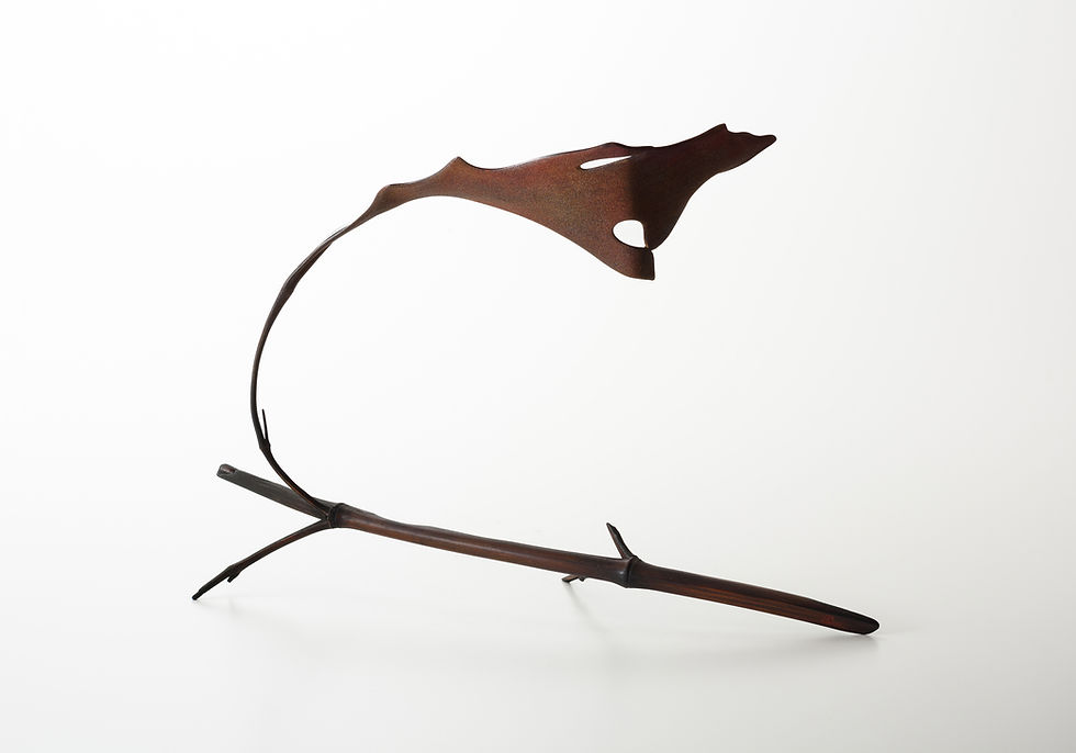 While lacquer works are typically solid, Muramoto seeks to create light forms conveying fluidity and movement. He has developed a technique of stretching fabric over bowed twigs to achieve this.